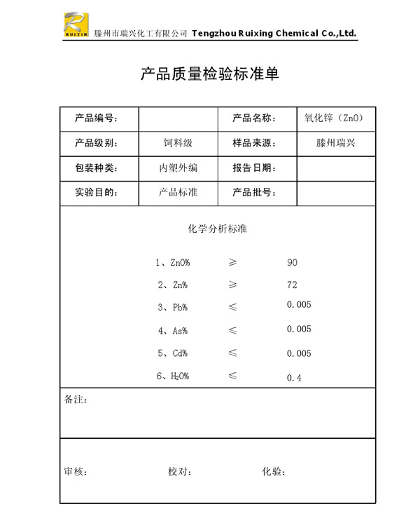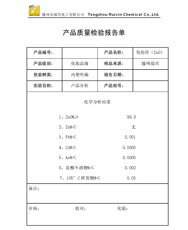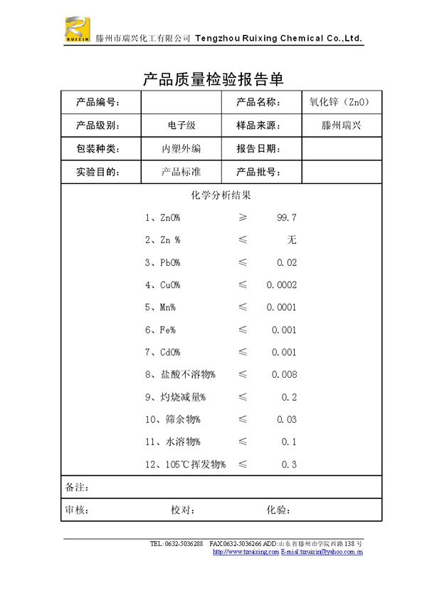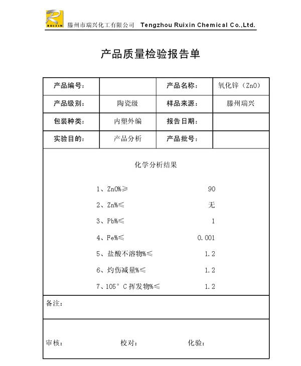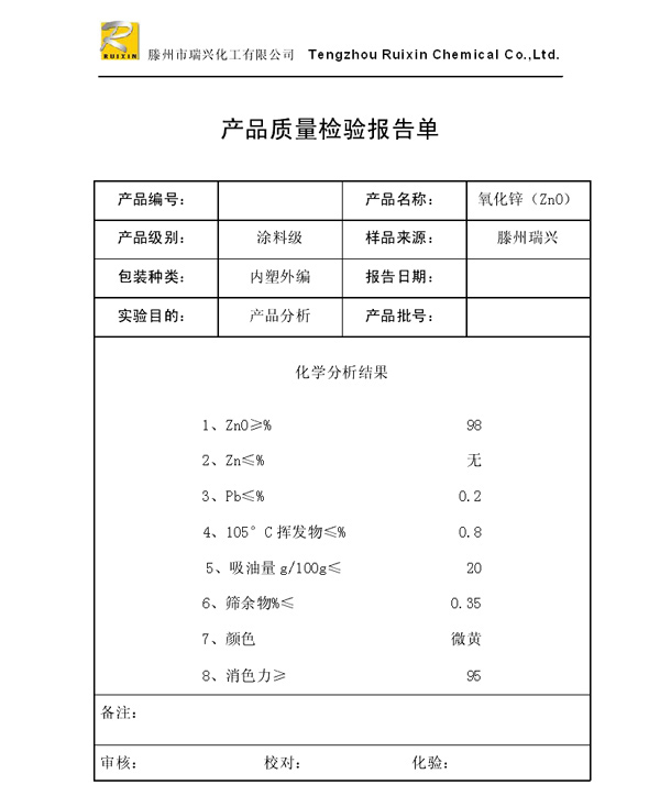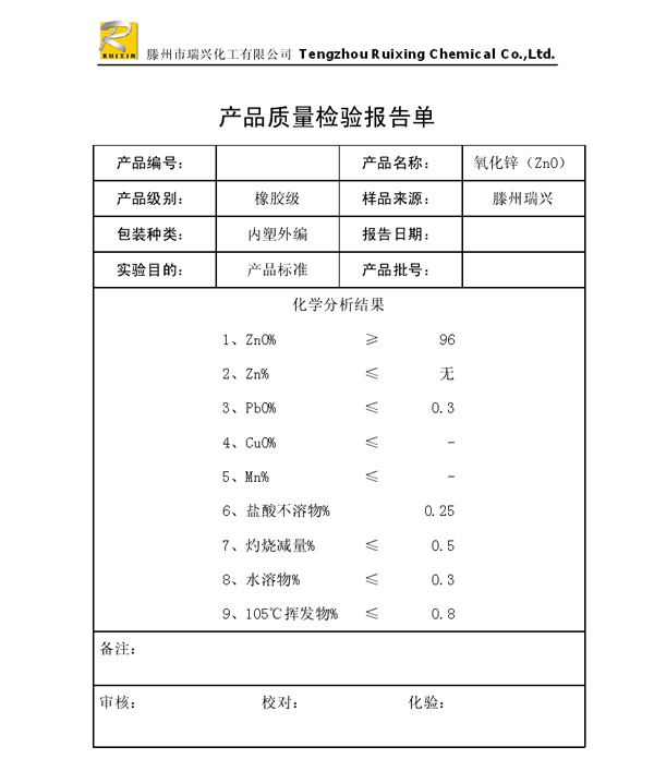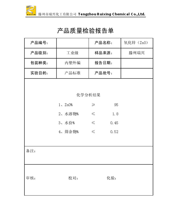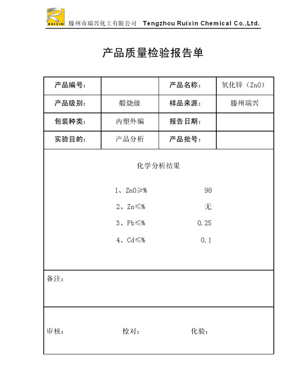 瑞興化工有限公司是生產(chǎn)氧化鋅的重點企業(yè),于2008年通過ISO9001:2008質(zhì)量管理體系認(rèn)證?!叭鹋d”牌氧化鋅在國內(nèi)擁有較大穩(wěn)定的市場,并遠(yuǎn)銷東南亞、中東、中南美等國家和地區(qū),在國內(nèi)外享有較高聲譽(yù)。